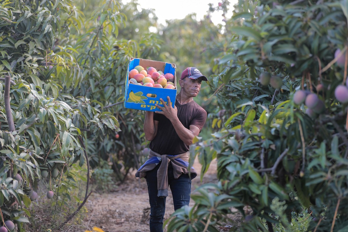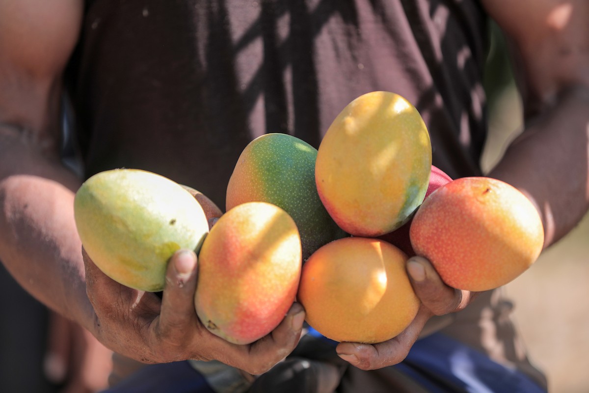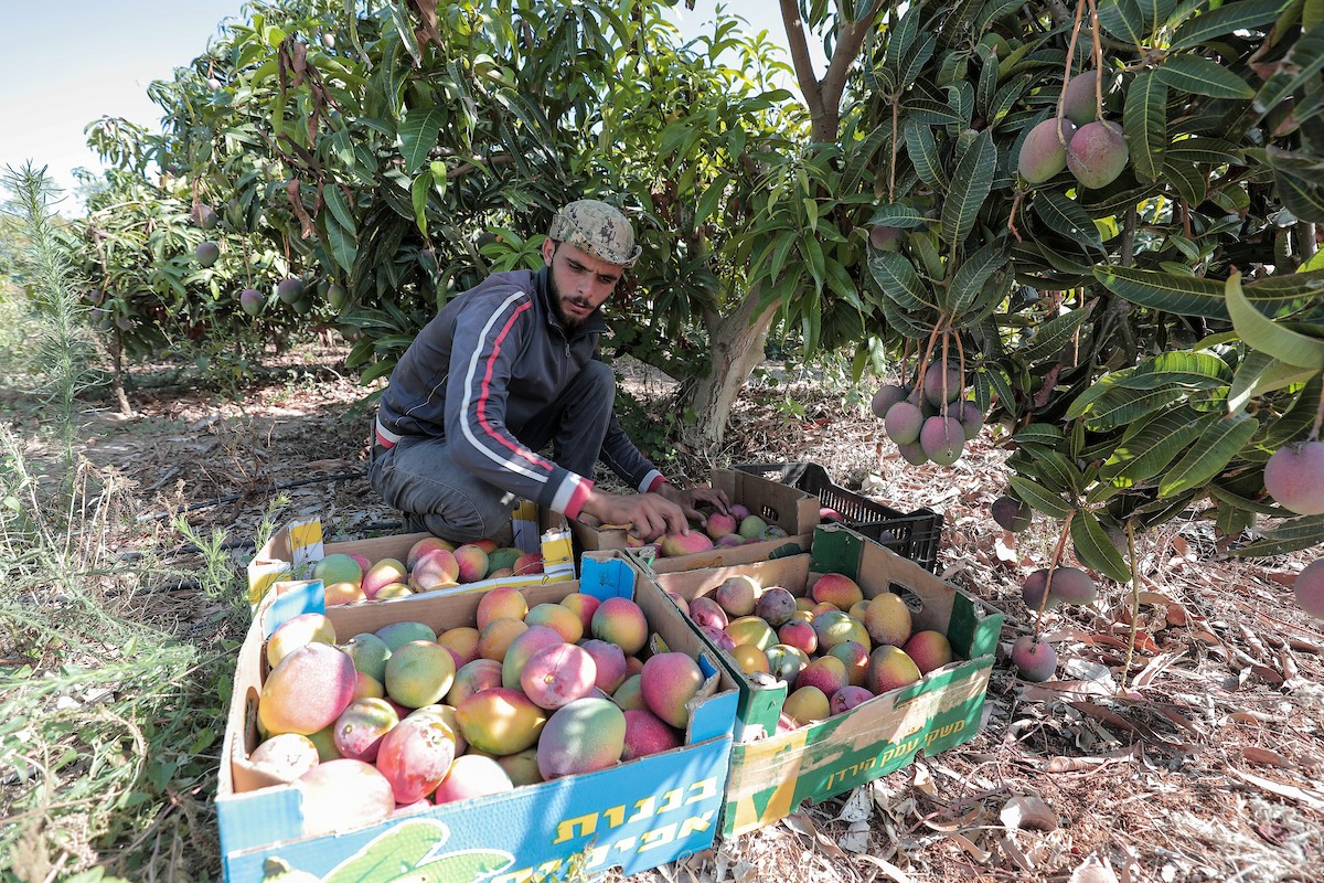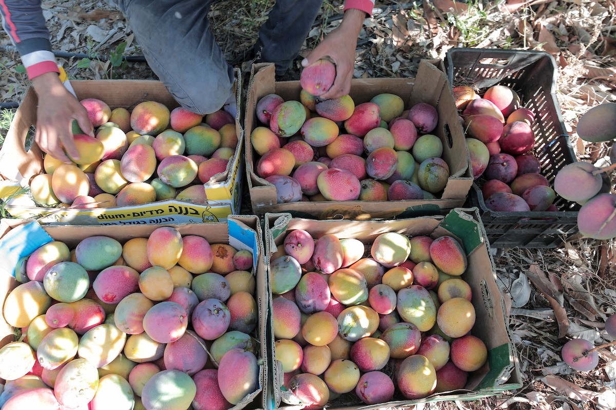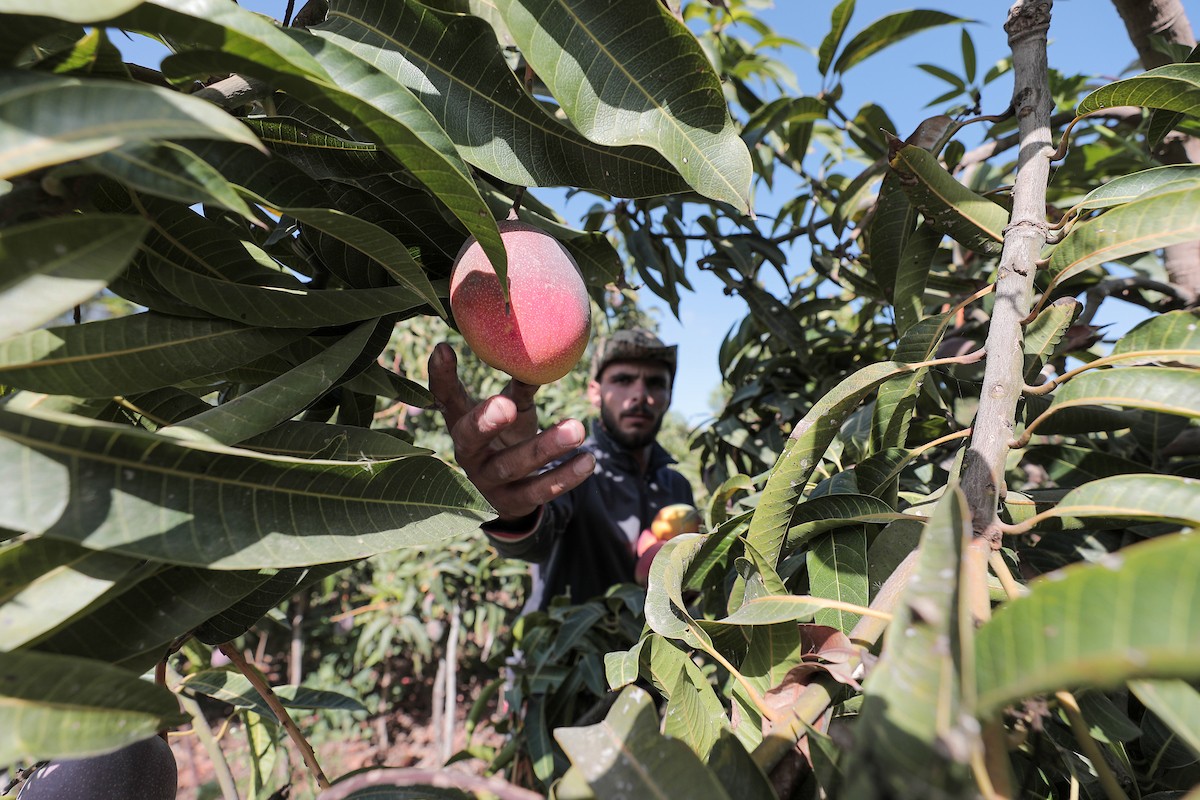 مزارعون فلسطينيون يقطفون المانجو خلال موسم حصادها في مدينة غزة
