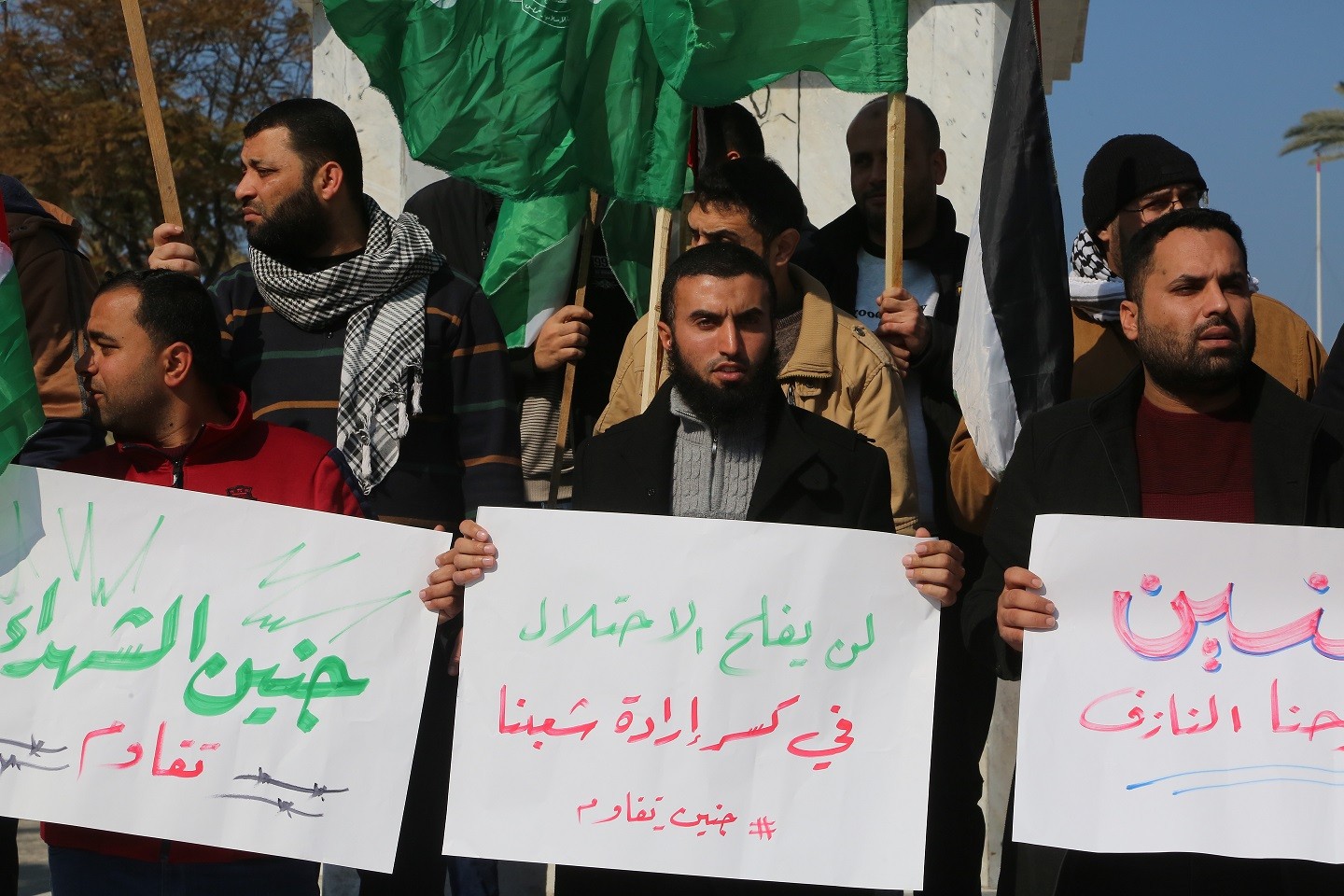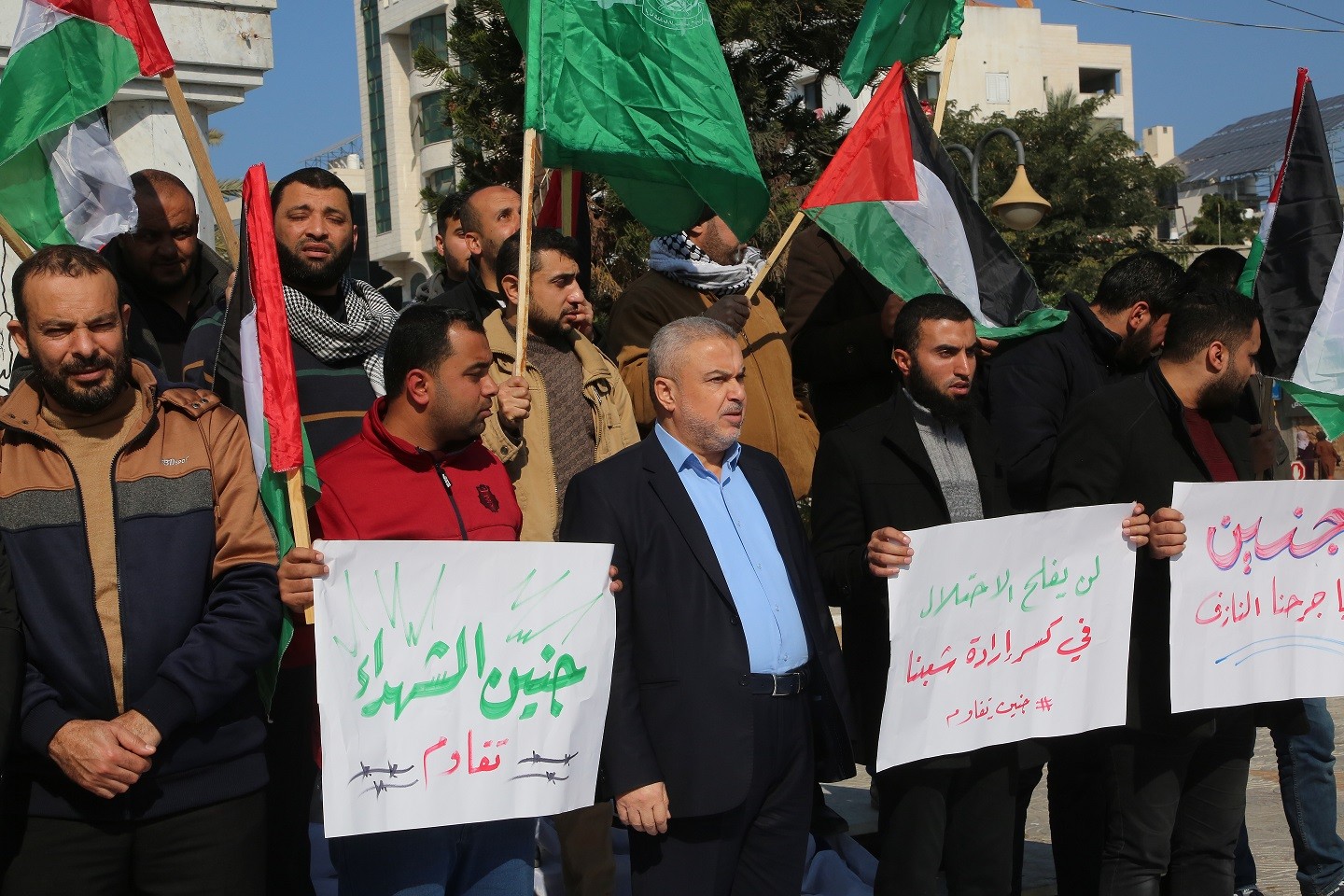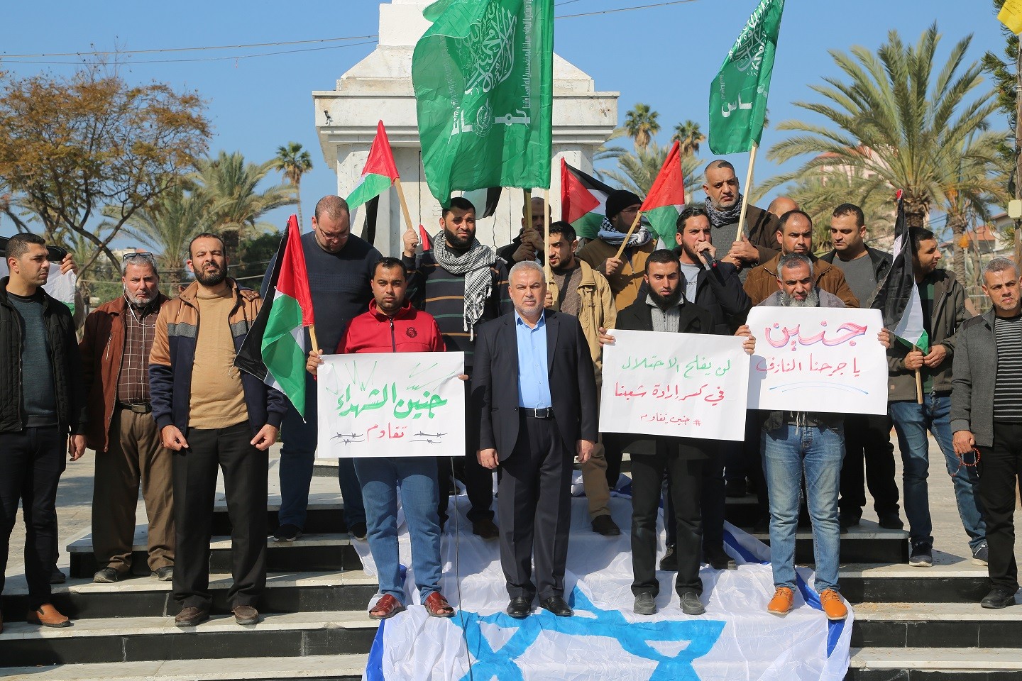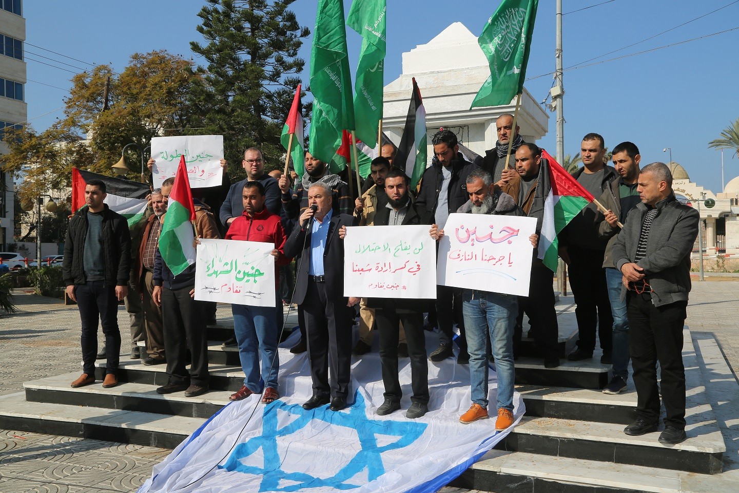 وقفة في ساحة الجندي المجهول في مدينة غزة تنديدا بمجزرة مخيم جنين صباح اليوم