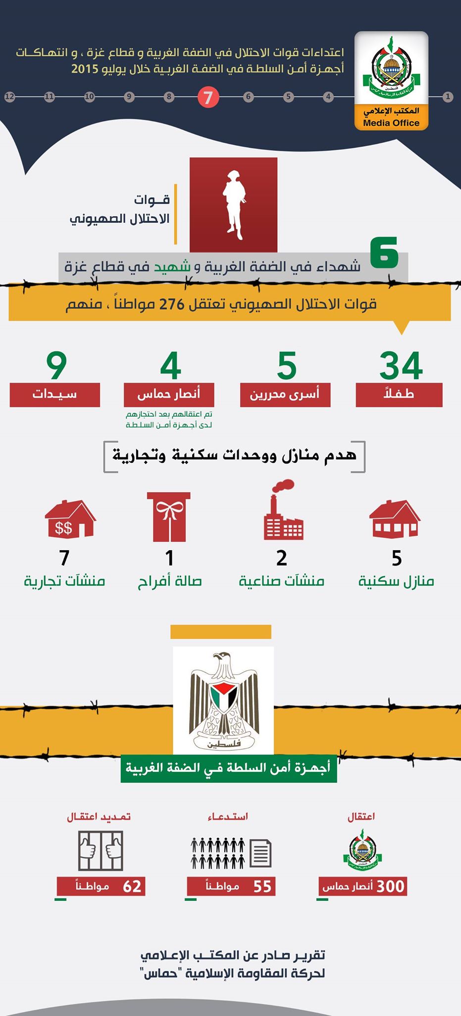أصدر المكتب الإعلامي لحركة المقاومة الإسلامية "حماس"، تقريره الشهري حول اعتداءات قوات الاحتلال (الإسرائيلي) في الضفة وقطاع غزة، وانتهاكات أجهزة أمن السلطة في الضفة المحتلة خلال شهر تموز (يوليو) الماضي.