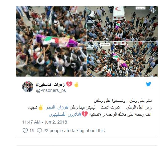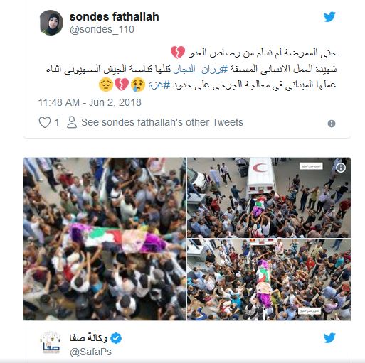 وسلّط المغردون الضوء على قيم وإنجازات النجار (21 عاماً) الإنسانية، كما شددوا على ضرورة محاسبة الاحتلال الإسرائيلي على جرائمه، وشاركوا صوراً وفيديوهات نقلت مراسم تشييع جثمانها، اليوم السبت.