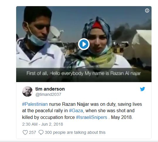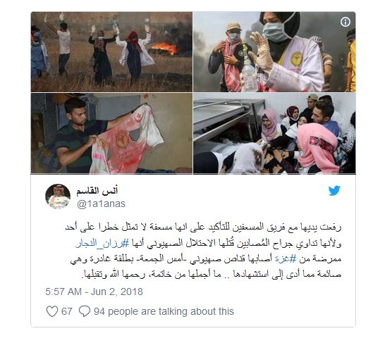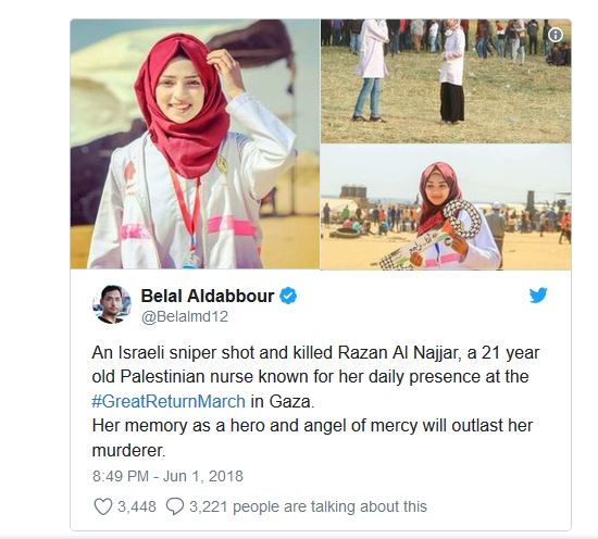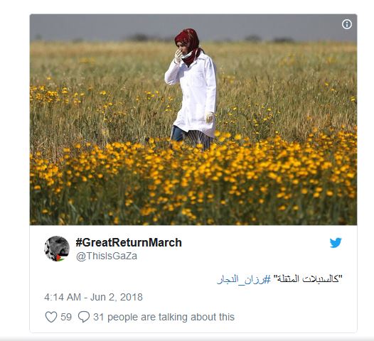 المنشورات كانت باللغتين العربية والإنكليزية، واستخدمت وسوم: "#رزان_النجار" و"#مسيرة_العودة" و"#غزة".