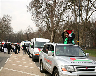 وتضم القافلة عدد من الناجين من حادث أسطول الحرية الذي اقتحمته قوات صهيونية في مايو (أيار) الماضي، وقد قطعت في جولتها حتى الآن أكثر من ثلاثة آلاف ميل بالبر من بريطانيا.