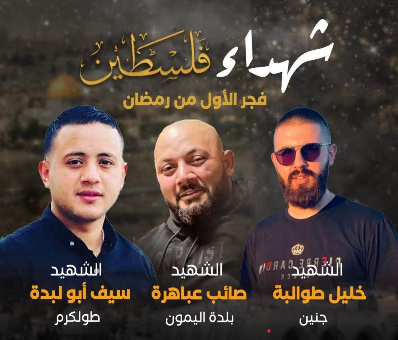 ونعت سرايا القدس شهداءها المجاهدين الأبطال: صائب عباهرة وخليل طوالبة وكلاهما من جنين، سيف أبو لبدة من طولكرم.
