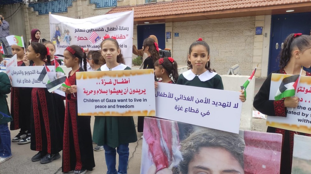 وذكر الأطفال: "نحن أطفال فلسطين من حقنا أن نعيش بدون حصار، من حقنا العيش بأمن وسلام وحرية.. من حقنا تلقي أفضل تعليم وعلاج.. من حقنا اللعب والمرح وممارسة كامل حقوقنا مثل باقي أطفال العالم."