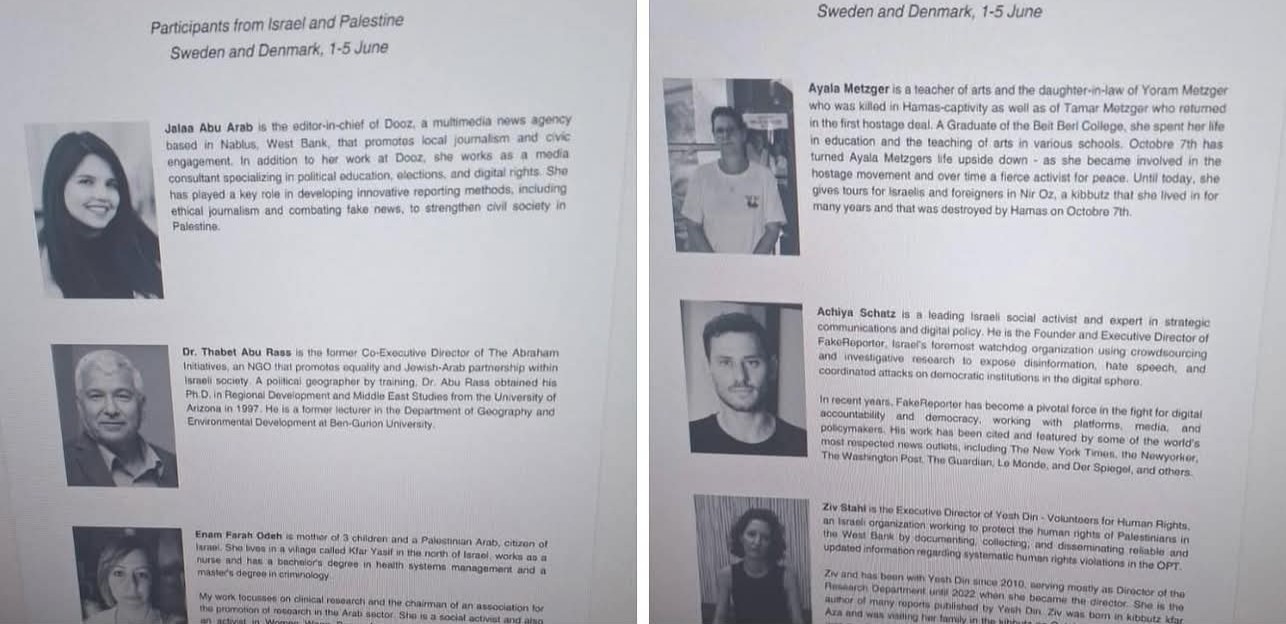وفقاً للوثائق والصور التي تم تسريبها، فقد ضم اللقاء التطبيعي عددًا من الشخصيات الإسرائيلية المعروفة، من بينهم عيالا متسجر، زوجة أسير إسرائيلي قُتل في غزة، وأخيّا شاتس، مؤسس منظمة "فاك ريبورتر" ذات العلاقة الوثيقة بجهاز الأمن الإسرائيلي، بالإضافة إلى مشاركين فلسطينيين أبرزهم: جلاء أبو عرب – رئيسة تحرير موقع “دوز” الإخباري. إيناس عودة – من كفر ياسيف. ثابت أبو راس – من النقب، وهو المدير السابق لشبكة “مبادرات إبراهيم” التطبيعية.