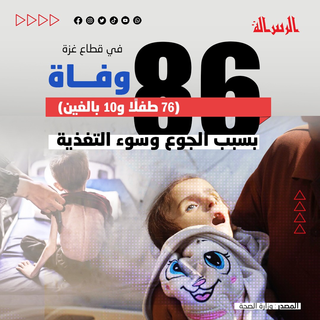 86 وفاة (76 طفلًا و10 بالغين) بسبب الجوع وسوء التغذية في قطاع غزة.