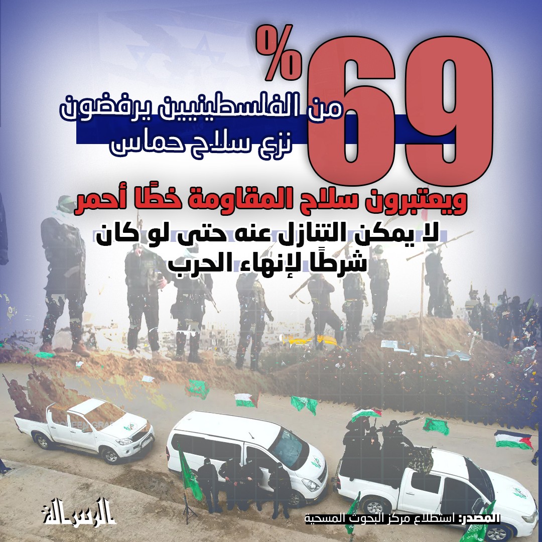 69% من الفلسطينيين يرفضون نزع سلاح حماس ويعتبرون سلاح المقاومة خطًا أحمر لا يمكن التنازل عنه حتى لو كان شرطًا لإنهاء الحرب.