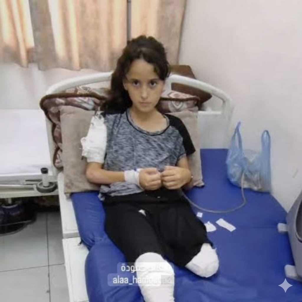 شام، ذات الاثني عشر عامًا، جميلة الملامح، رقيقة القسمات، تحمل في عينيها مزيجًا من الألم والانتظار. قبل أسابيع فقط، كانت تلعب مع صديقاتها أمام باب منزلها، تضحك وتخطط لأيام المدرسة القادمة، قبل أن تغيّر قذيفة أطلقتها طائرات الاحتلال مسار حياتها إلى الأبد.