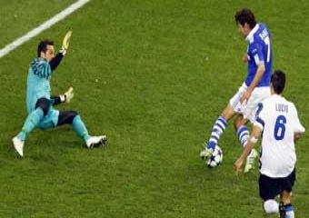 ولم يشهد الشوط اي فرص محققة سوى تسديدة ستانكوفيتش بالدقيقة 37 من زمن المباراة التي أخرجها نوير حارس شالكه قبل ان ينجح الاسباني المخضرم راؤول جونزاليس في تسجيل هدف التقدم لشالكه في الوقت المحتسب بدل الضائع من الشوط الاول عندما انفرد بالبرازيلي جوليو سيزار حارس الانتر ليمر منه ويضعها في المرمى الخالي ليقضى على امال الانتر في بلوغ الدور التالي.